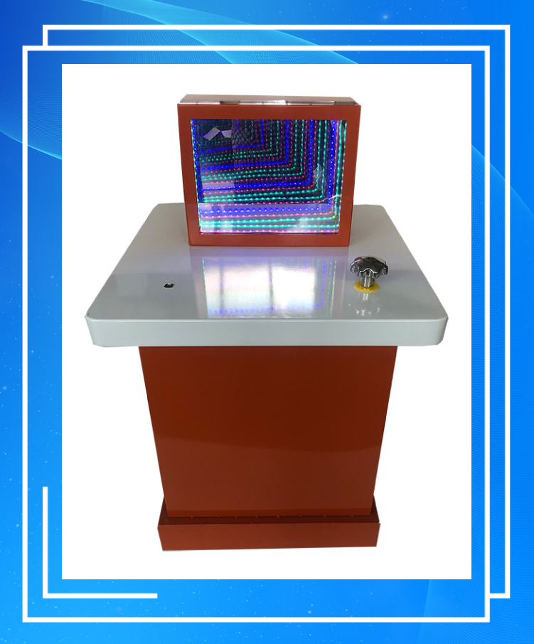 三、功能概述:展品由箱體、半透半反鏡、反射鏡、LED燈組、發(fā)光模型、擺動機構(gòu)和操作手輪組成。前端是一面半透半反鏡,后端是反射鏡,燈光發(fā)出的光線被反射鏡反射回來,一部分透過半透半反鏡而被看到,另一部分被半透半反鏡再次反射到后端反射鏡,多次反射后形成諸多物體的像,無限重復(fù)的影像,一個比一個更遠,就像一條無盡的隧道。當(dāng)擺動后端反射鏡時,光的反射路徑發(fā)生了變化,就會看到彎曲的光隧道。