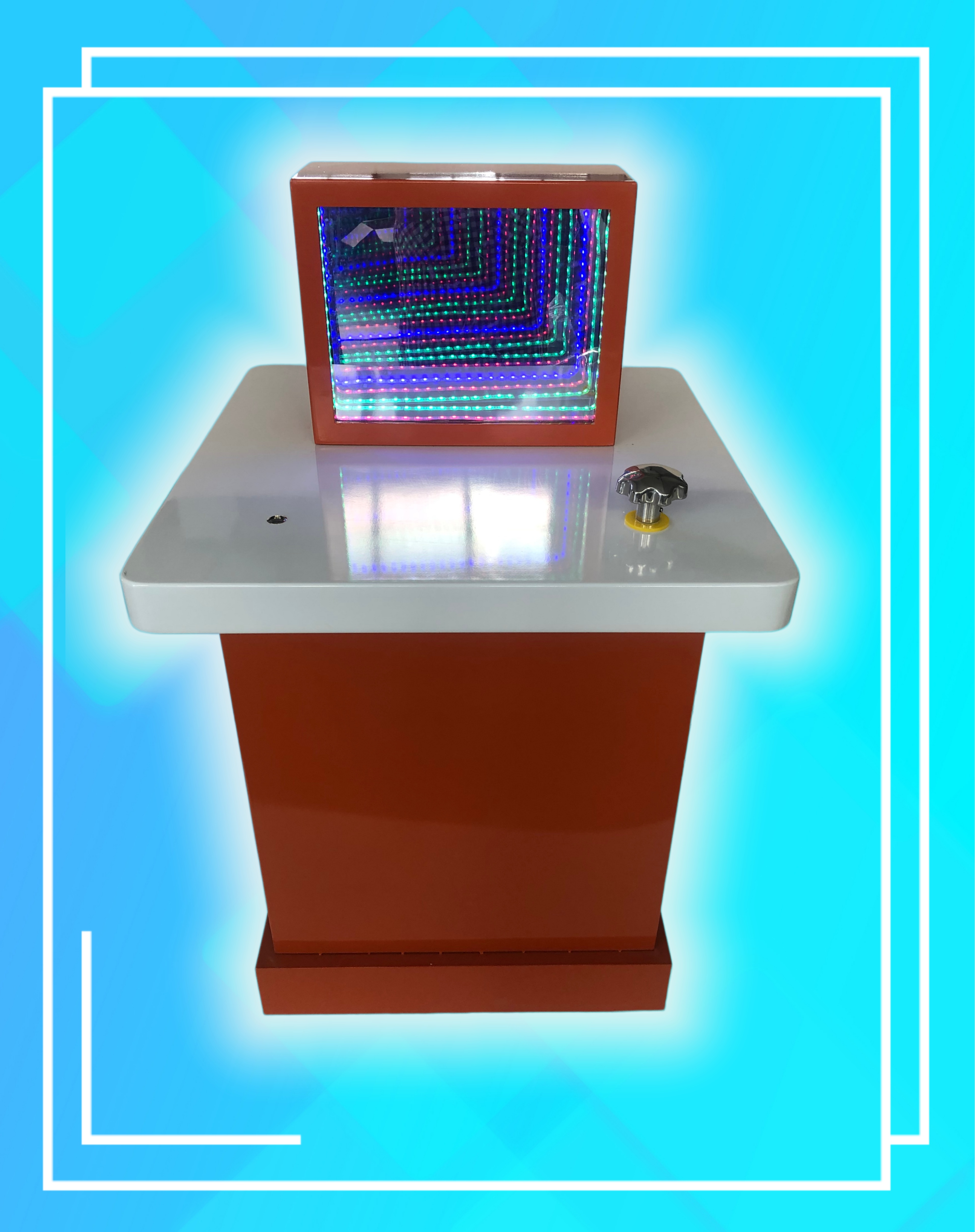 三、功能概述:展品由箱體、半透半反鏡、反射鏡、LED燈組、發(fā)光模型、擺動(dòng)機(jī)構(gòu)和操作手輪組成。前端是一面半透半反鏡,后端是反射鏡,燈光發(fā)出的光線被反射鏡反射回來,一部分透過半透半反鏡而被看到,另一部分被半透半反鏡再次反射到后端反射鏡,多次反射后形成諸多物體的像,無限重復(fù)的影像,一個(gè)比一個(gè)更遠(yuǎn),就像一條無盡的隧道。當(dāng)擺動(dòng)后端反射鏡時(shí),光的反射路徑發(fā)生了變化,就會(huì)看到彎曲的光隧道。