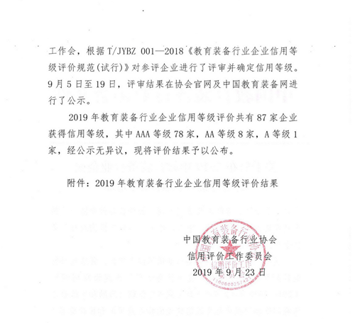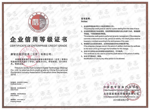 康智達(dá)公司榮獲中國教育裝備行業(yè)協(xié)會企業(yè)信用等級評價AAA級證書