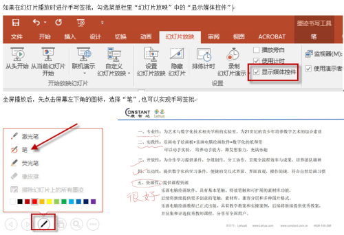 如果在幻燈片播放時進(jìn)行手寫簽批,勾選菜單欄里“幻燈片放映”中的“顯示媒體控件”
