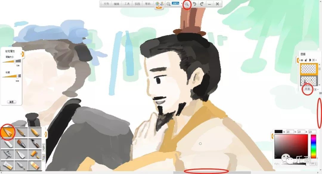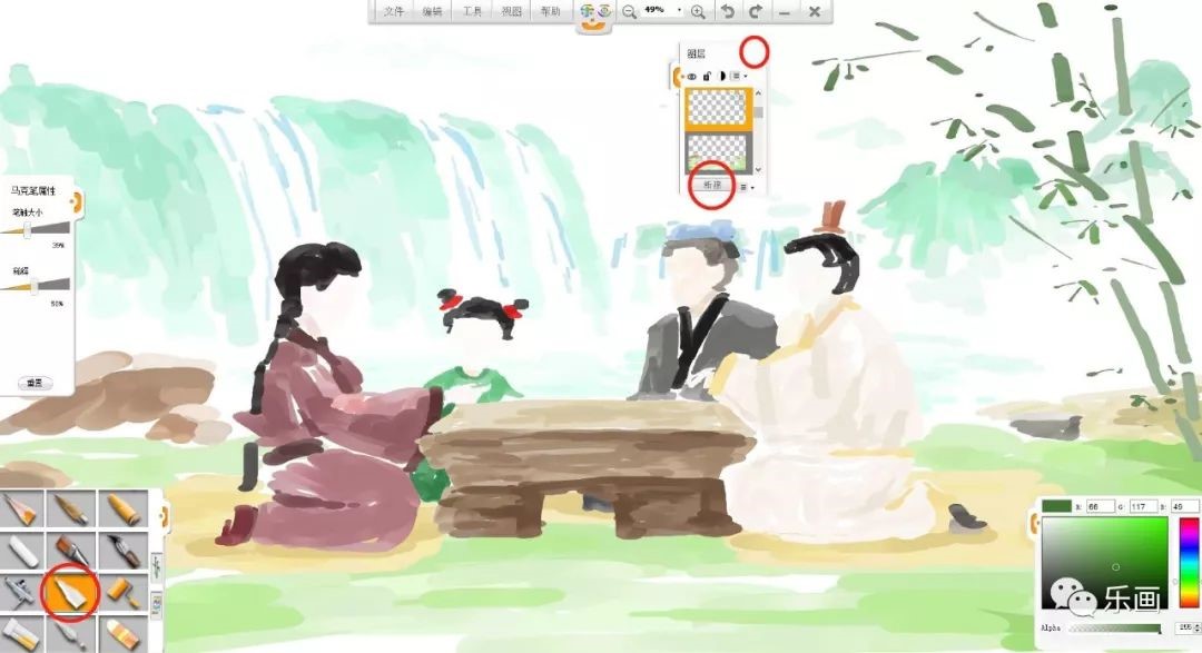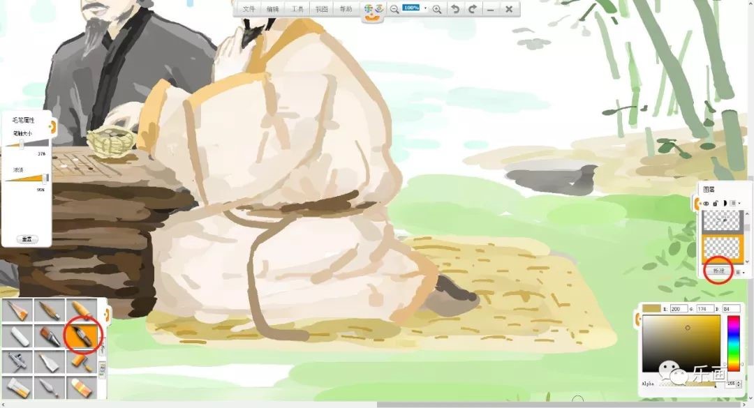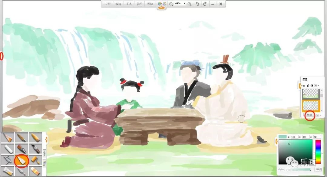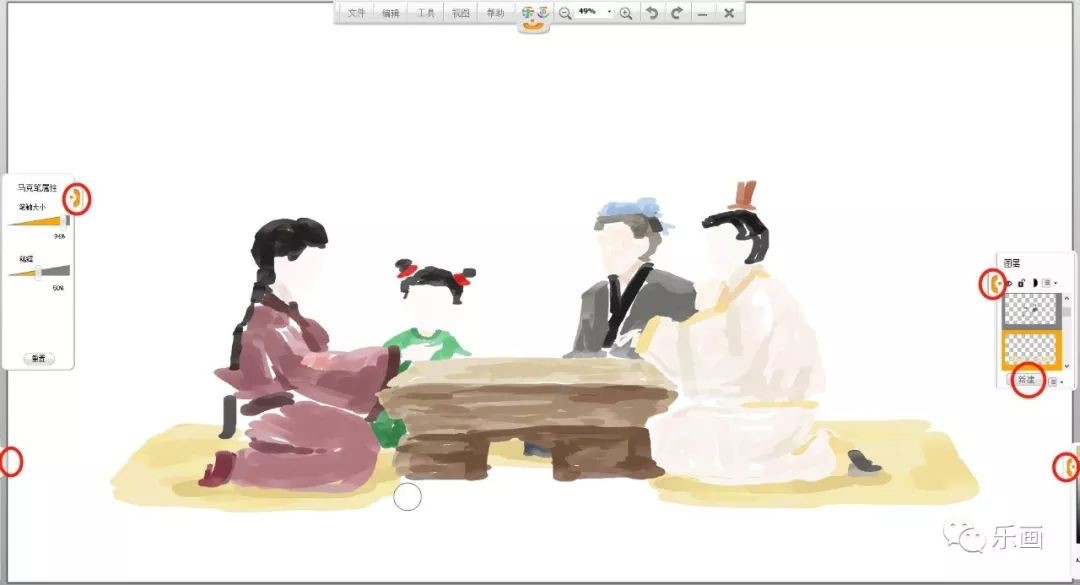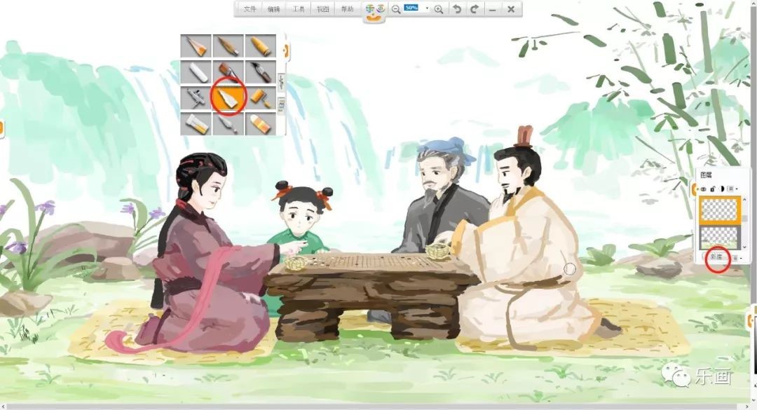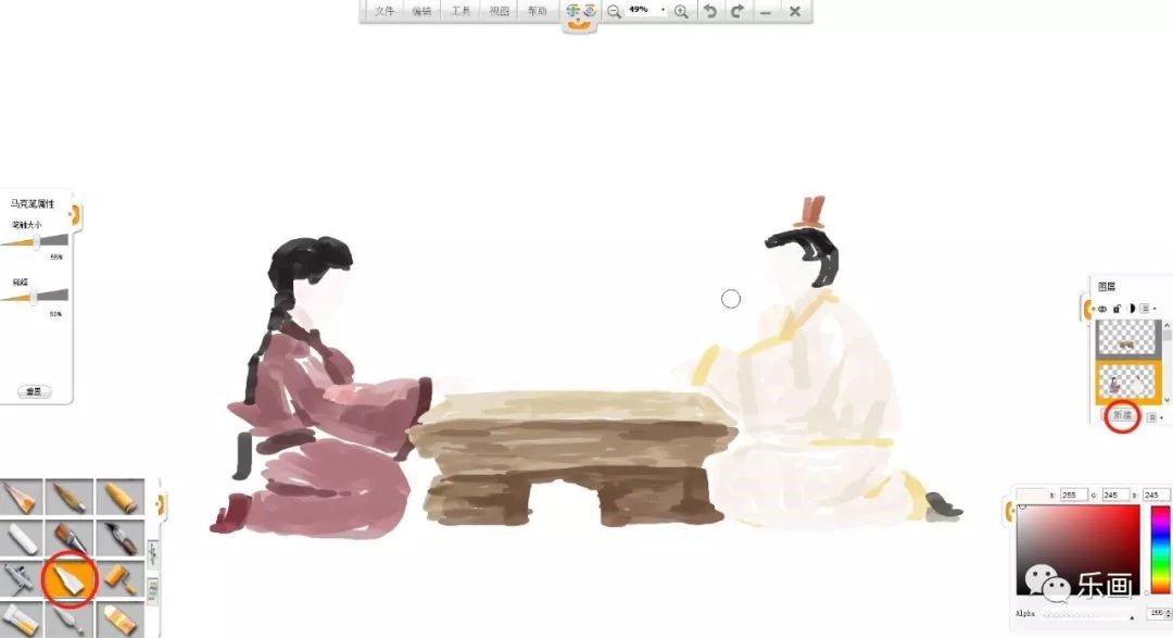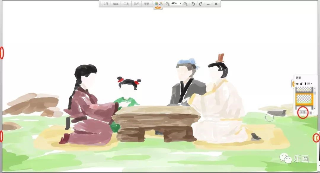 再新建一個圖層,繪制對弈夫婦二人的大概形象。考慮前后關系,石桌會擋住人物,所以新建的圖層要放在石桌圖層下面,圖層順序可以用樂畫電子畫筆筆尖或鼠標點住圖層,上下拖動調整,也可以使用圖層面板工具“上移”或“下移”。