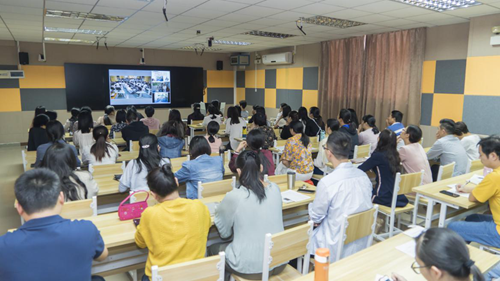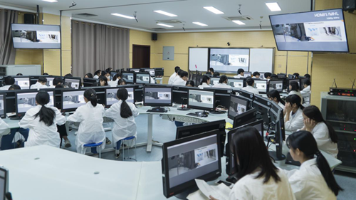 2019年10月31日,廣東省食品藥品職業技術學校的學生們像往常一樣進行實訓課程教學。但與以往普遍職校實訓教學不一樣的是,老師和少部分學生在實訓室上課,大部分學生在智慧課室上課,老師在實訓室對設備結構和操作進行講解,學生在互動智慧課室通過座位前的屏幕觀看老師上課。聽課的老師們則在另外的觀課室對課程進行全程的觀摩。