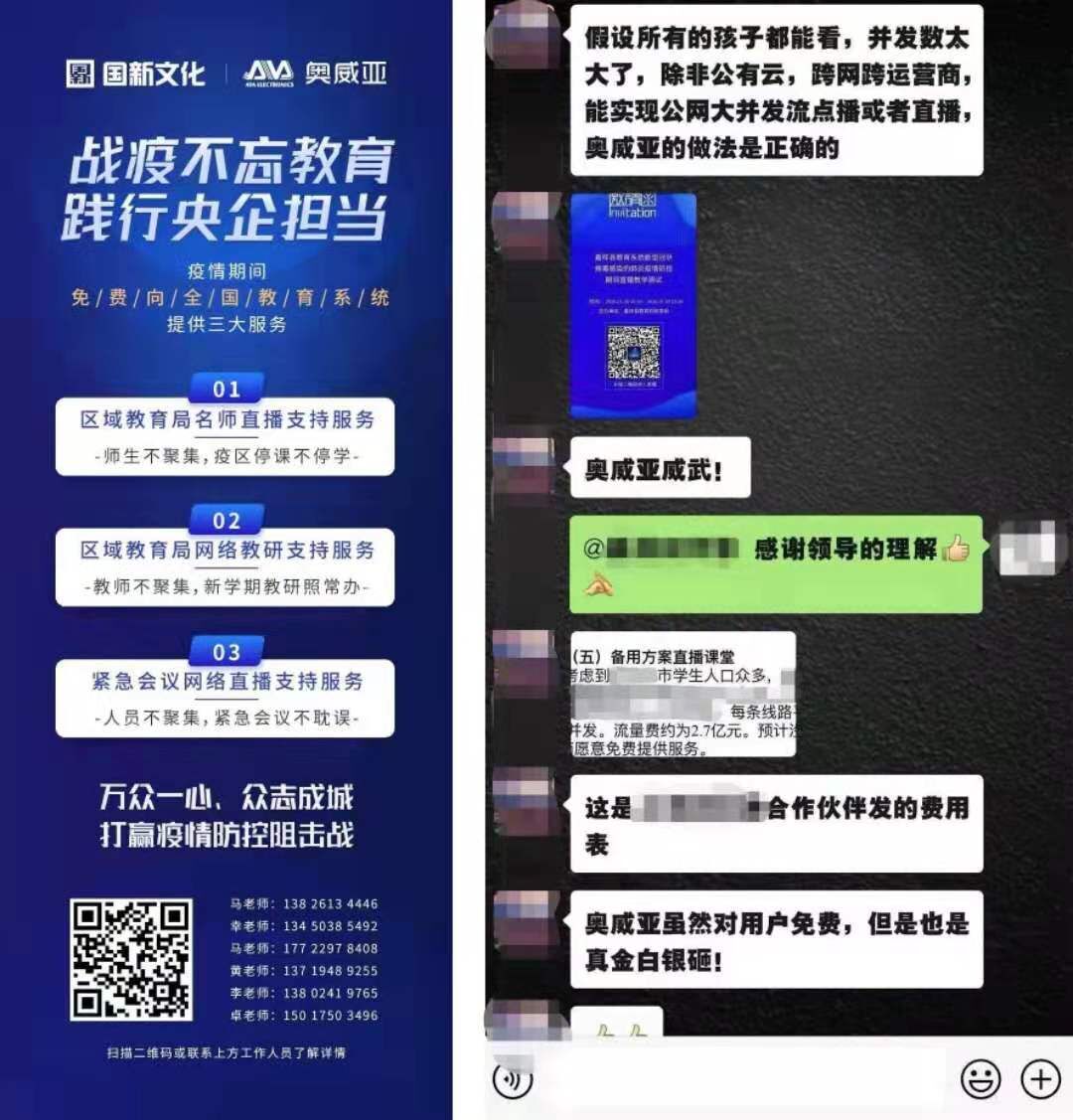 在各地紛紛發出“延期開學”通知之時,為滿足教育系統網絡遠程教學、教研工作的需求,奧威亞快速響應,第一時間面向全國教育系統力推三大免費服務(疫情期間)免費服務一經推出,立刻得到全國各地教育系統的強烈反響和一致認同。