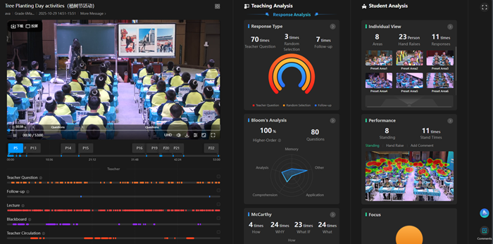 在課堂實施過程中,系統能夠實時采集學生行為數據,并生成客觀、可視化的課堂反饋,輔助教師精準把握學情動態,實現基于數據的教學決策。在教師專業發展方面,系統通過長期追蹤教師的教學能力、教學行為與教研表現等多維特征,開展專業的常模研究,記錄周期性教師成長變化,助力教師實現從“經驗型”到“實證型”的專業躍遷。