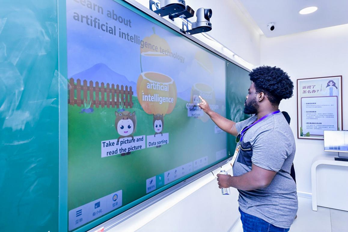 美國交流代表現場使用希沃白板的互動功能,體驗來自中國上海教師設計的人工智能科普課程互動游戲