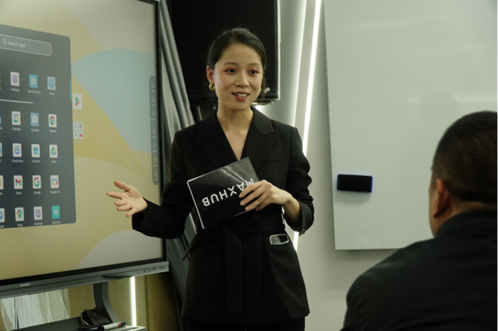 視源股份印度尼西亞營銷負責人由宜瑋(Martina)女士在展廳為來賓進行產品演示