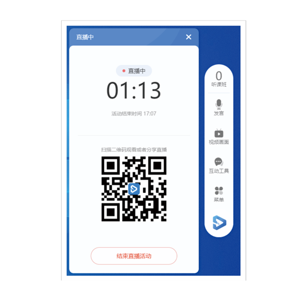 為了幫助老師輕松開啟線上教學,讓老師更專心投入課堂教學,在高質(zhì)量班班通方案的支持下,學校老師可即時創(chuàng)建直播間,生成課程直播二維碼,其他老師或觀眾只需通過手機、電腦掃碼便能進入觀看課堂,隨時隨地開始學習。
