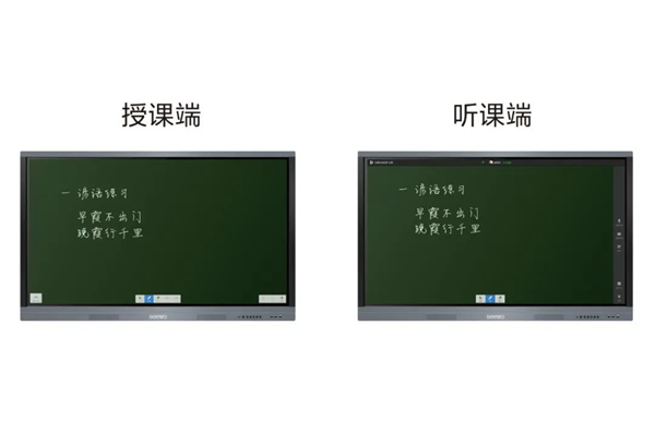 為助力提升專遞課堂質(zhì)量,促進學生有效學習,高質(zhì)量班班通解決方案支持通過希沃遠程互動助手,實現(xiàn)高效有趣的課堂互動。在課堂教學中,老師可以借助希沃遠程互動助手,輕松實現(xiàn)異地板書同步、多課堂競賽、遠程拍照上傳分享學習成果等,讓兩地學生仿若置身同一教室共同學習,營造了良好的課堂氛圍,讓學生成為課堂的主體,主動積極參與課堂互動,從而提高課堂教學實效。