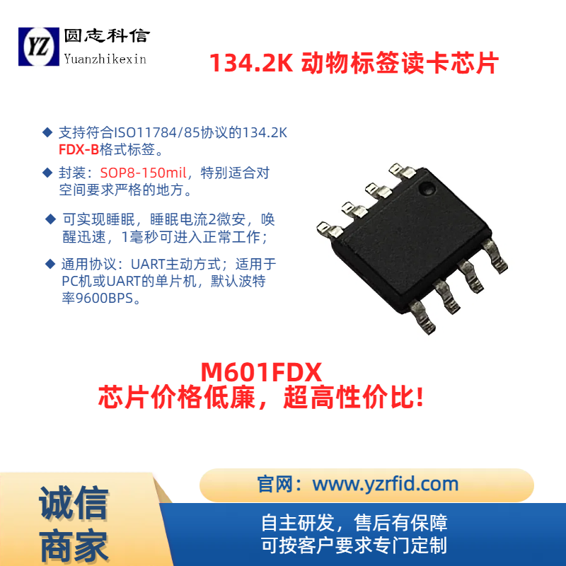 產(chǎn)品詳細(xì)介紹M601FDX 134.2K FDX-B格式標(biāo)簽讀卡芯片 >>產(chǎn)品描述 可實(shí)現(xiàn)對(duì)134.2K FDX-B格式動(dòng)物標(biāo)簽的讀取 外圍電路簡(jiǎn)單 可實(shí)現(xiàn)睡眠,睡眠電流2微安,喚醒迅速,1毫秒可進(jìn)入正常工作 無(wú)需接外部晶振,可減少外部器件數(shù)量 支持134.2K FDX-B格式動(dòng)物標(biāo)簽卡 適用于PC機(jī)或UART的單片機(jī),默認(rèn)波特率9600BPS 封裝:SOP8-150mil,特別適合對(duì)空間要求嚴(yán)格的地方 配以M601FDX評(píng)估板KF601FDX,可實(shí)現(xiàn)用戶(hù)應(yīng)用快速開(kāi)發(fā),以達(dá)到短時(shí)間進(jìn)入市場(chǎng)目的