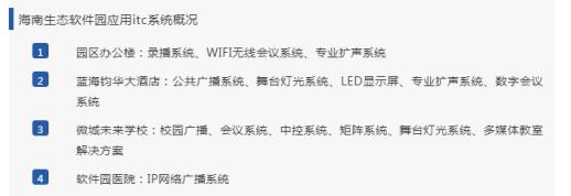 本次海南生態軟件園建設中,itc提供了多套會議、擴聲、舞臺燈光等系統方案,不僅針對不同場所進行設計,使之更符合實際應用與室內建設,更是在安裝過程中有條不紊、耐心培訓,全體使用人員均對此非常滿意。