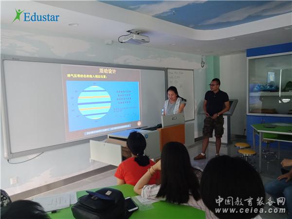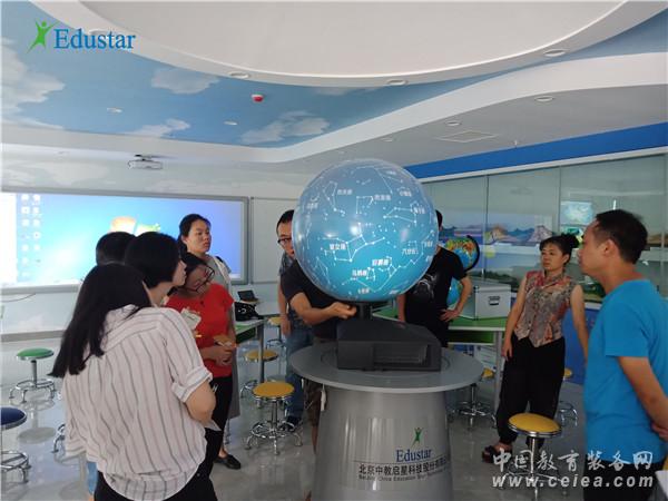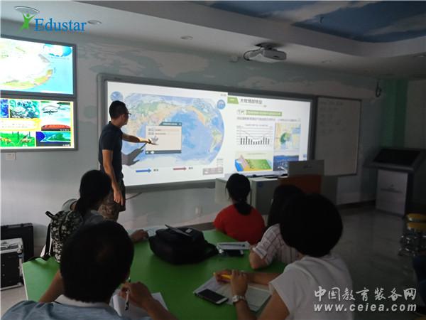 在深度體驗專用教室各類設備的教學應用特點、熟練掌握軟硬件操作使用方法之后,老師們被中教啟星數字星球系統、交互教學系統等現代教育裝備強大的教學功能折服。其中,數字星球系統能瞬間將圖片、視頻、動畫等多媒體資源展示到數字化球形投影屏幕上,動態立體地再現自然科學和社會科學的現象與過程,其直觀、生動的展示效果讓在場的老師們驚嘆不已。