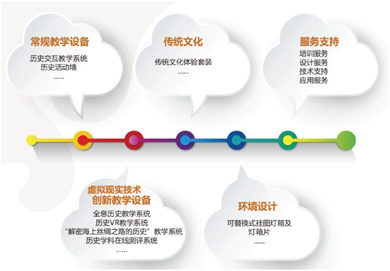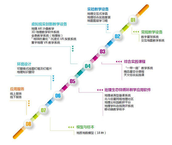 現代教育裝備:數字星球系統,中學數字化地理專用教室、中學歷史專用教室、虛擬現實實驗室、數學探究實驗室,小學科學教室、新建校整體解決方案、教育創客空間;教育信息化:教育公用服務平臺、人人通解決方案、生態化教學研環境構建方案、區域教育資源中心解決方案、微課平臺校外科技教育:綜合實踐基地整體解決方案、青少年活動中心解決方案、科技館建設整體解決方案