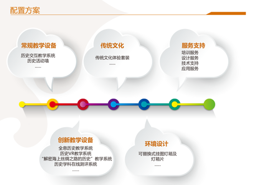 依據(jù)教學(xué)功能,歷史教室設(shè)備配置主要劃分為:教學(xué)專用設(shè)備與資源、創(chuàng)新教學(xué)設(shè)備與課程、傳統(tǒng)文化體驗套裝、模型教具及教室文化五大核心模塊,其中核心設(shè)備如下: