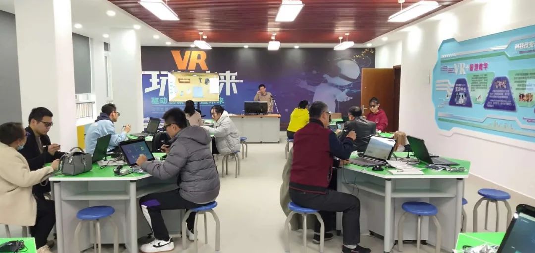 培訓(xùn)當(dāng)天,學(xué)校相關(guān)學(xué)科(物理、化學(xué)、生物、地理、歷史、信息、科學(xué))和對VR技術(shù)感興趣的老師們,在新落成的“VR虛擬現(xiàn)實實驗室”進(jìn)行培訓(xùn)。