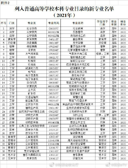 根據《普通高等學校本科專業設置管理規定》,教育部組織開展了2020年度普通高等學校本科專業設置和調整工作。經申報、公示、審核等程序,對各地各高校向教育部申請備案的專業予以備案……根據高等學校專業設置與教學指導委員會評議結果,確定了同意設置的國家控制布點專業和尚未列入專業目錄的新專業名單。