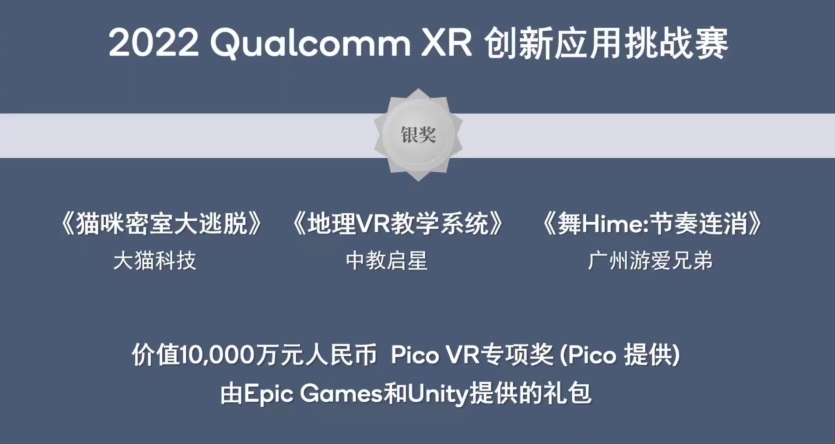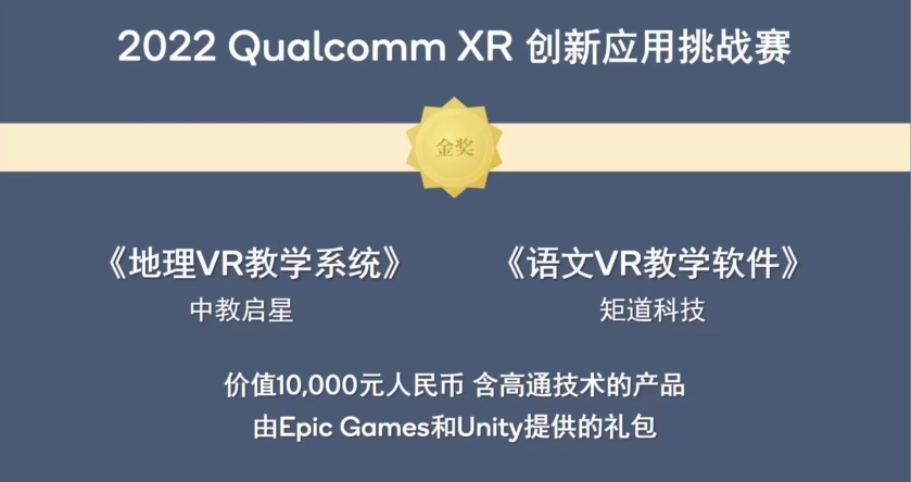 “2022 Qualcomm XR 創新應用挑戰賽”整個賽程共設立10組賽道,41個獲獎名額。自3月17日正式啟動報名以來,先后收到了超過450來自海內外XR領域的參賽作品,大賽評審從最終提交的230多個符合大賽要求的作品中,評選出70多個優秀參賽作品入圍決賽環節,最終有39個優秀參賽作品分別獲得本屆大賽白金獎、金獎和銀獎。北京中教啟星科技股份有限公司的地理研學VR教學系統榮獲VR行業組產品金獎,并在PICO VR專業組中斬獲銀獎。