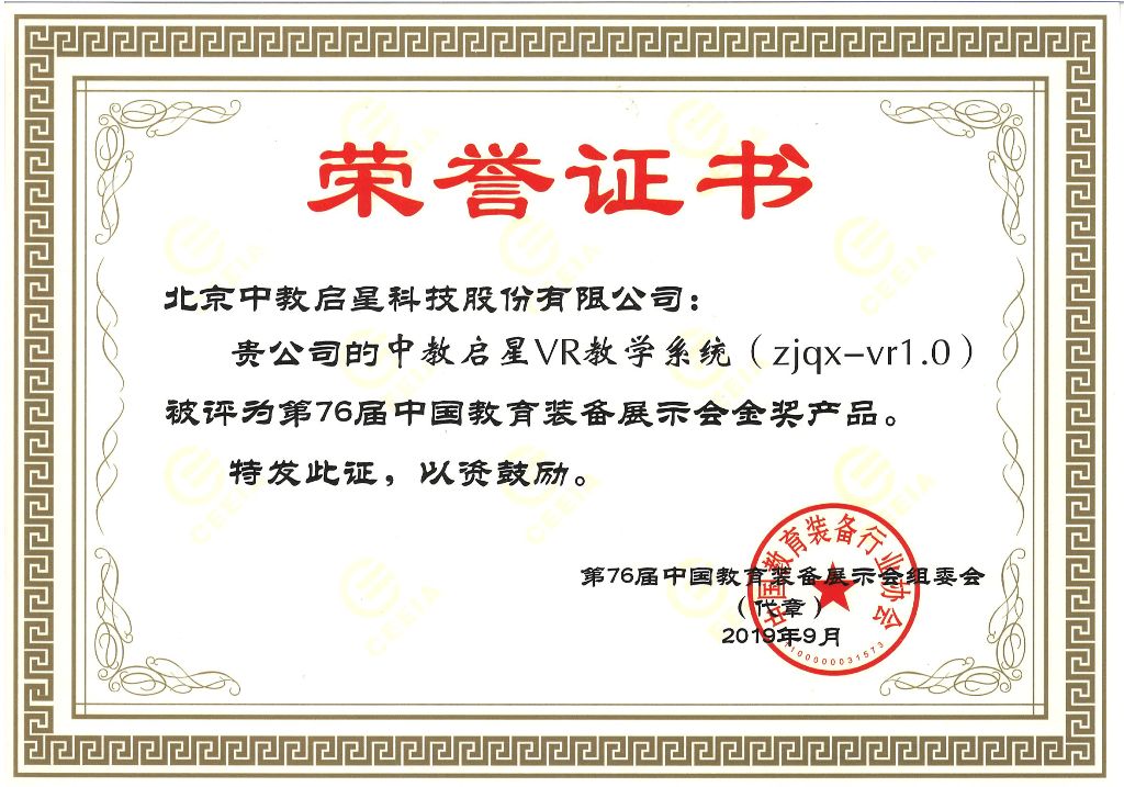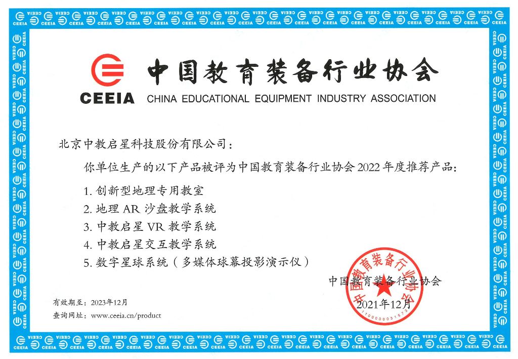 作為中國教育裝備領軍企業之一的中教啟星,這幾年,積極推進VR產品在行業內的應用,連續打造推出寰宇地理VR教學系統、文明的足跡VR教學系統等覆蓋初高中地理、歷史所有知識點的VR資源產品,已連續多次榮獲中國教育裝備行業協會產品金獎和推薦產品稱號,有效推動了更多VR產品在教育行業內扎根、發展和應用。