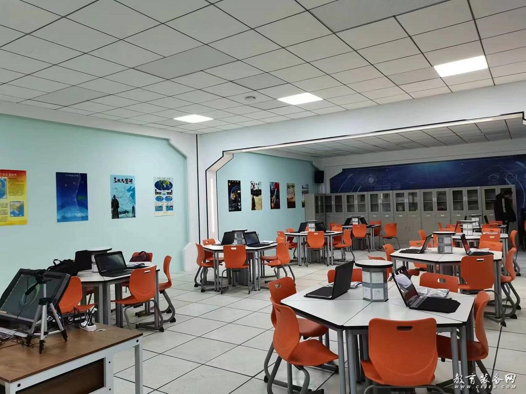 整間教室包括中教啟星VR一體機(教師機)及啟星VR移動課堂(學(xué)生端),配備大量高中地理、歷史、理化生等五個學(xué)科的VR教學(xué)資源。輔以極具虛擬現(xiàn)實特色的窗簾、背景墻和知識展板,整體現(xiàn)代風(fēng)的環(huán)境設(shè)計十分引人注目。