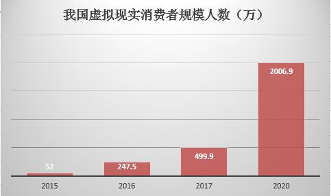 虛擬現實技術已經逐步的融入到人們的日常生活中,用戶規模不斷提升。數據顯示,2015年至2017年我國虛擬現實消費者規模為52萬人、247.5萬人、499.9萬人,據中商產業研究院預測,2020年規模將達到2006.9萬人。