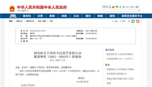 國務院印發了《全民科學素質行動規劃綱要(2021—2035年)》(以下簡稱《科學素質綱要》)指出2035年遠景目標:我國公民具備科學素質的比例達到25%,城鄉、區域科學素質發展差距顯著縮小,為進入創新型國家前列奠定堅實社會基礎。2020年公民具備科學素質的比例為10.56%,即到2035年我國公民科學素質總數要增加14.44%。