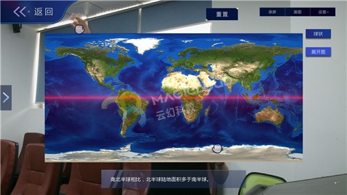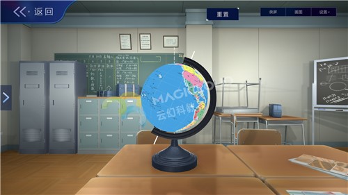 云幻科教VR地理仿真實(shí)驗(yàn)資源通過《麥哲倫航行》故事視頻引入,吸引學(xué)生注意力。后續(xù)通過虛擬仿真技術(shù)模擬地球模型、地球儀等內(nèi)容進(jìn)行知識(shí)教學(xué),互動(dòng)操作猶如將地球置于手中,知識(shí)可視化、操作趣味化、模式多樣化,集中學(xué)生注意力,活躍課堂氣氛,提高教學(xué)效率。