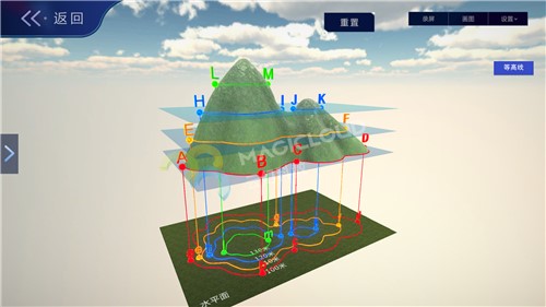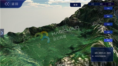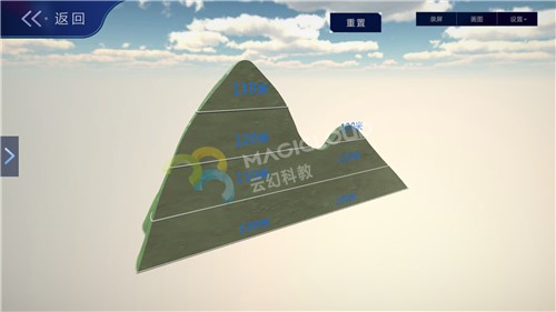 云幻科教VR地理仿真實(shí)驗(yàn)資源制作等高線的地形模型,使用不同顏色標(biāo)注不同海拔的等高線,便于學(xué)生理解等高線地形圖的繪制原理,通過不同的地形模型,引導(dǎo)學(xué)生認(rèn)識(shí)各種地表形態(tài)的名稱、特點(diǎn),輕松學(xué)習(xí)地理知識(shí)。