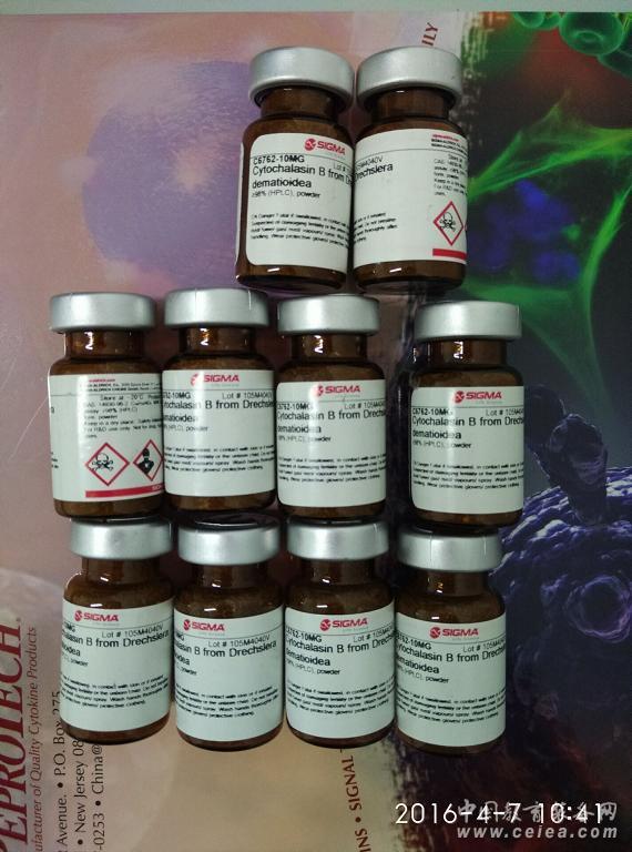 說明:細胞研究工具;肌動蛋白聚合的鑒定。 別名:松胞菌素B;松孢素B;細胞分裂抑素B;Phomin 分子式:C29H37NO5 分子量:479.61 CAS:14930-96-2 外觀:白色結晶性粉末 來源:Drechslera dematioidea 純度:≥98% (HPLC) 溶解性:溶于乙醇,參考濃度20 mg/ml。可溶于DMSO 儲存:-20℃ From Sigma C6762