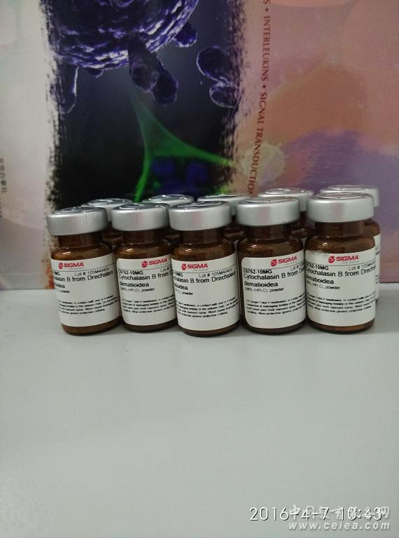 說明:細胞研究工具;肌動蛋白聚合的鑒定。 別名:松胞菌素B;松孢素B;細胞分裂抑素B;Phomin 分子式:C29H37NO5 分子量:479.61 CAS:14930-96-2 外觀:白色結晶性粉末 來源:Drechslera dematioidea 純度:≥98% (HPLC) 溶解性:溶于乙醇,參考濃度20 mg/ml。可溶于DMSO 儲存:-20℃ From Sigma C6762