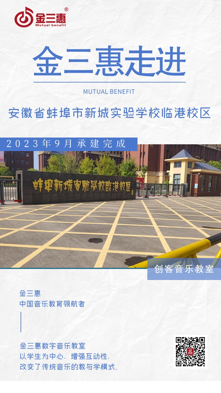 2023年9月,金三惠數(shù)字音樂教室為安徽省蚌埠市新城實驗學(xué)校臨港校區(qū)提供、安裝、培訓(xùn)的24+1智慧創(chuàng)客音樂教室正式開始使用!配備了金三惠教學(xué)系統(tǒng)、電鋼琴、數(shù)字音樂教學(xué)儀等教學(xué)教具。