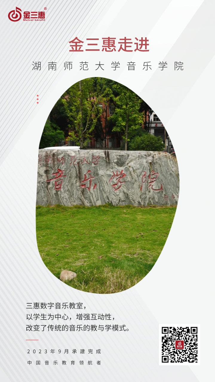 2023年9月,金三惠數字音樂教室走進湖南師范大學音樂學院,為學生提供了18+1、32+1的電鋼琴教室,配備了金三惠電鋼琴教學系統、電鋼琴、數字音樂教學儀等教學教具等。