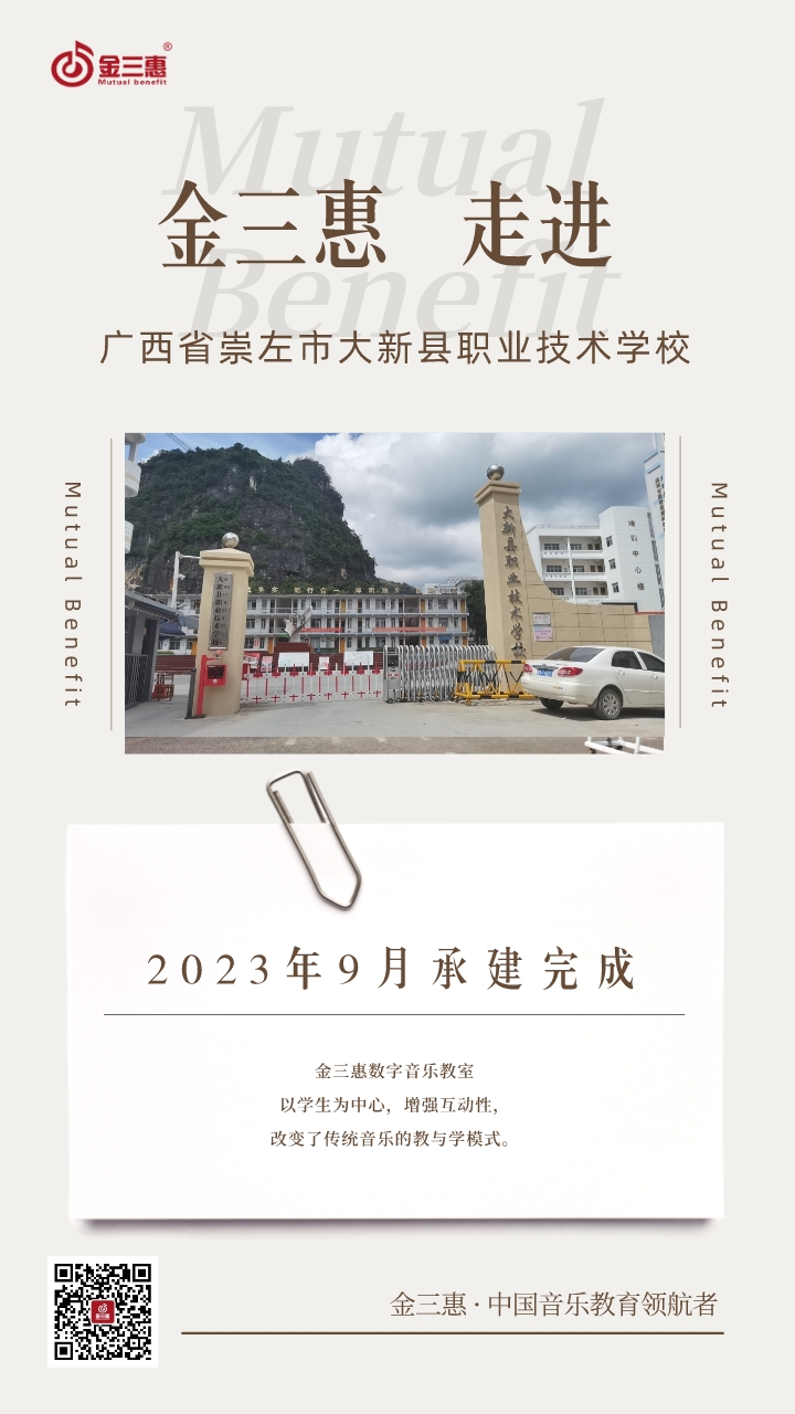 2023年9月,金三惠數字音樂教室走進廣西省崇左市大新縣職業技術學校,為學生提供了40+1的電鋼琴教室配備了金三惠電鋼琴教學系統、電鋼琴、數字音樂教學儀等教學教具等。電鋼琴室-金三惠 (jinsanhui.com)