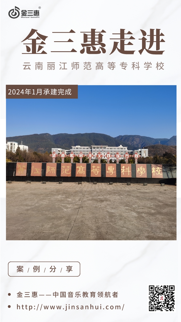 2024年1月,金三惠數字音樂教室走進云南麗江師范高等專科學校,為學校提供了60+1的電鋼琴教室配備了金三惠電鋼琴教學系統、電鋼琴、數字音樂教學儀等教學教具等。