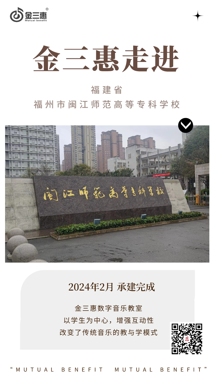 2024年2月,金三惠數字音樂教室走進福建省福州市閩江師范高等專科學校,為學校提供了43+1和40+1的電鋼琴教室,配備了金三惠電鋼琴教學系統、電鋼琴、數字音樂教學儀等教學教具等。