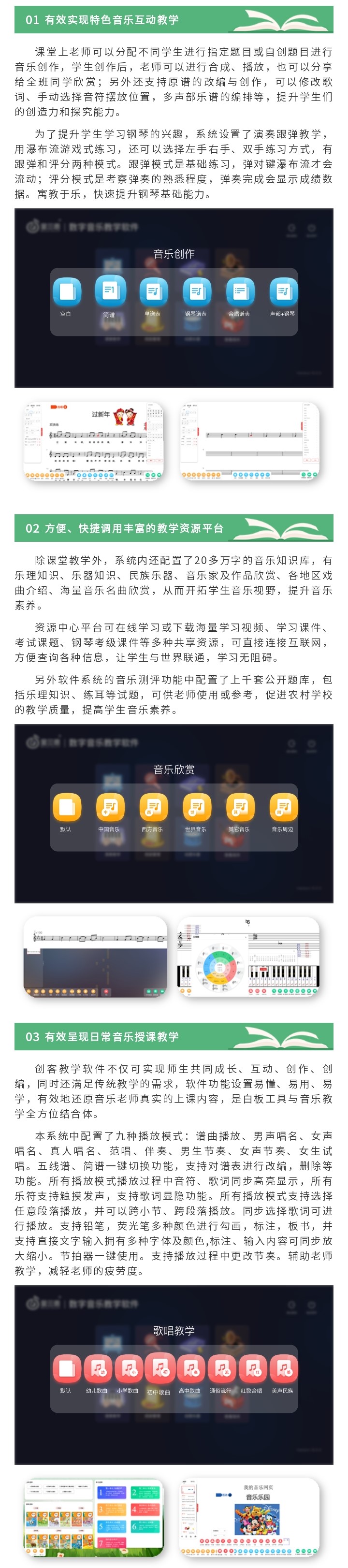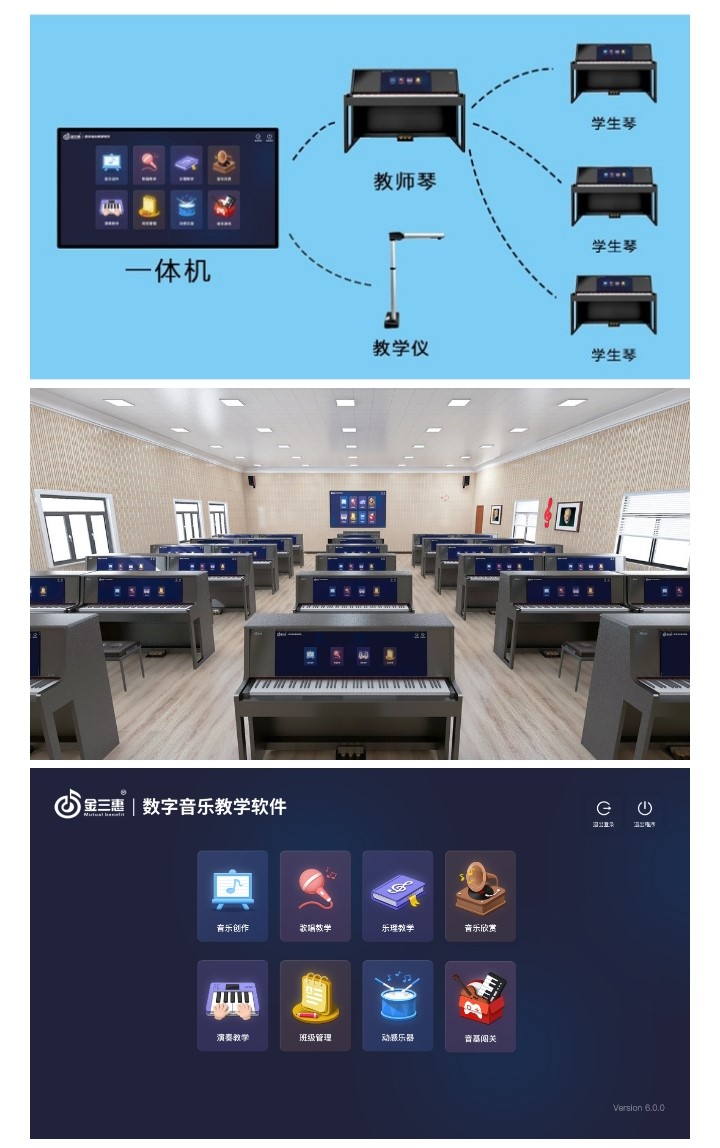 金三惠提供一站式「新常態音樂教室解決方案」「數字音樂教育綜合解決方案」,熱銷產品有:數字音樂教學軟件、美育測評訓練平臺、電鋼琴/電子琴教學管理軟件、電鋼琴教室、智慧音樂素養教室、數字電教板、各大類音樂器材、音樂教學設備等。為區域音樂教育提供管、教、學、評、練綜合平臺,打造智慧平臺+智能硬件+數字資源+智能管控+教學評價為一體的全場景學習生態,實現區域數字化音樂教育轉型。