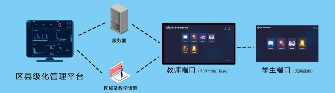 數(shù)字化音樂教學(xué)平臺是通過區(qū)/縣的服務(wù)器,建設(shè)區(qū)級/縣/校級教學(xué)平臺,結(jié)合配套教學(xué)內(nèi)容,輔助區(qū)/縣或?qū)W校開好、開齊音樂課,讓孩子享受優(yōu)質(zhì)的教學(xué)資源,更好的提升孩子音樂知識水平,推進(jìn)區(qū)/縣或?qū)W校的美育素養(yǎng)發(fā)展。