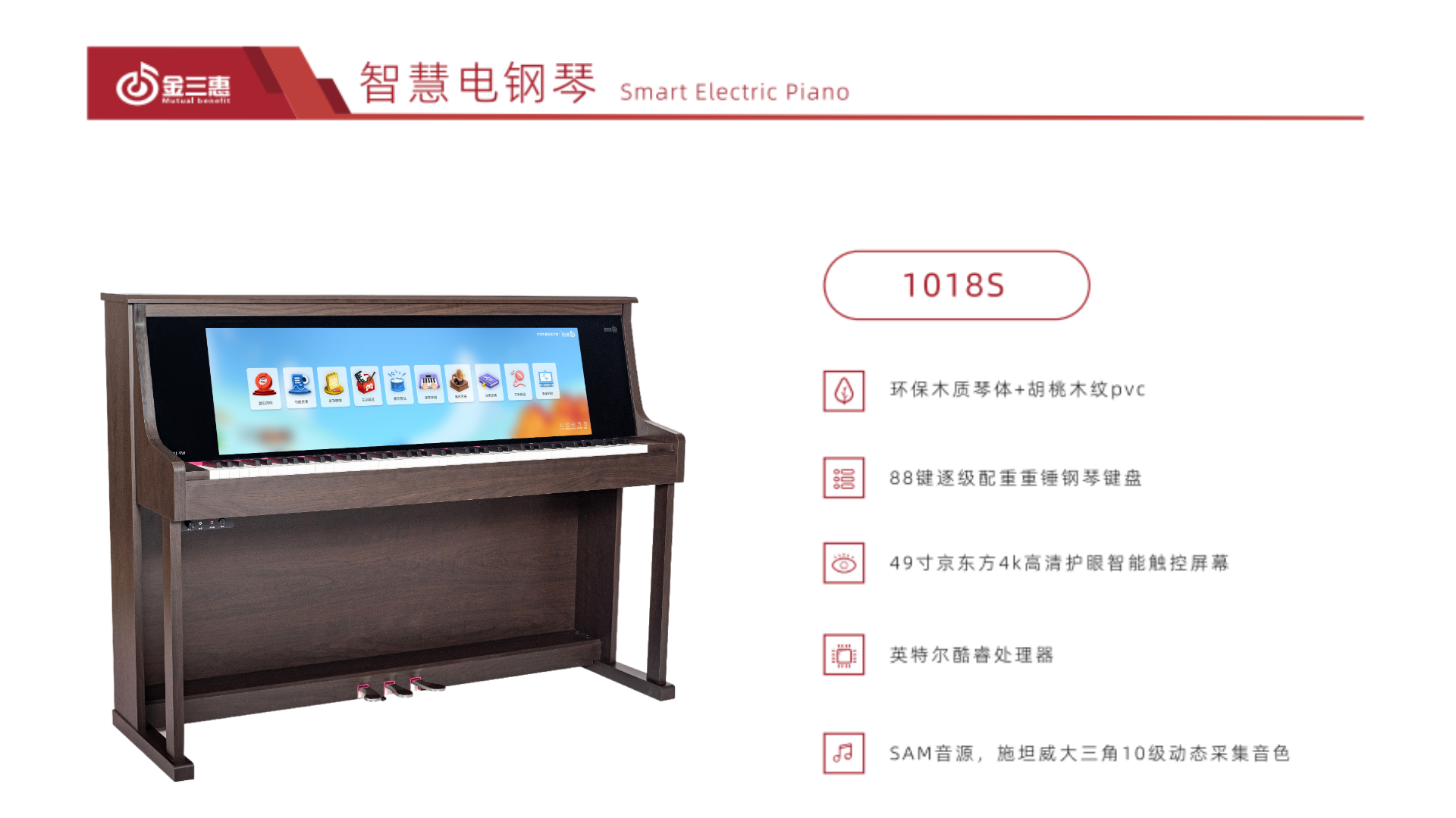 智慧電鋼琴1018S:是金三惠工廠生產線升級后,推出的第一款重磅產品。采用定制43寸超寬京東方4k高清護眼智能屏,酷睿高性能CPU,施坦威鋼琴原聲采樣音源、AI智能音頻處理器、琴體采用國家一級環保板材等。