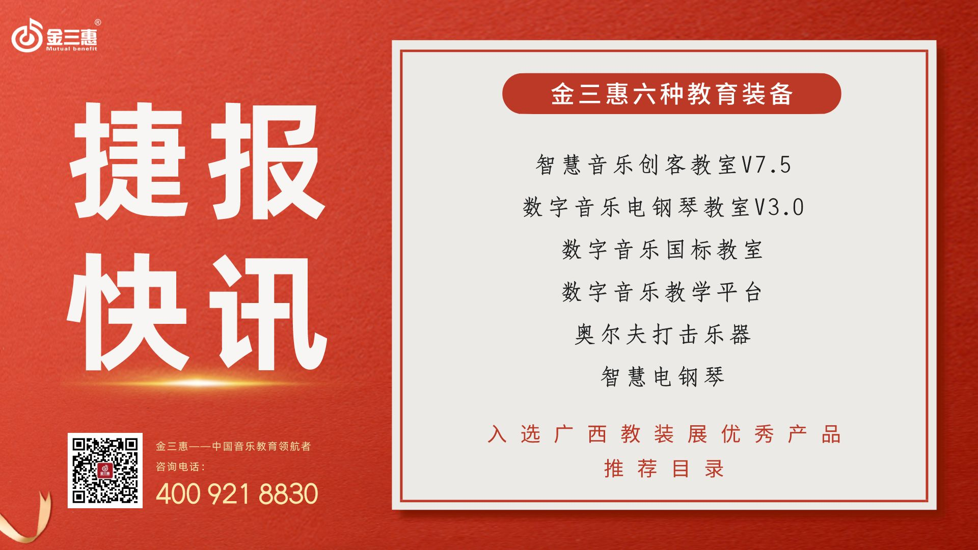 2023年8月10日,廣西教育裝備行業協會發布《關于公布第12屆廣西教育裝備展示會優秀產品現場遴選活動入圍結果的通知》,金三惠自主研發的六種教育裝備——智慧音樂創客教室V7.5、數字音樂電鋼琴教室V3.0、數字音樂國標教室、數字音樂教學平臺、奧爾夫、智慧電鋼琴從眾多參評產品中脫穎而出,榮譽登榜!