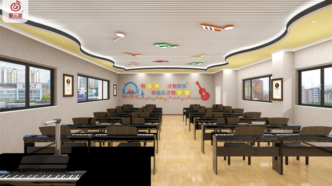 √配備了智慧電鋼琴及多種學生樂器,適用于小、中、高階段學生聲樂、樂器教學和音樂興趣小組的開展;