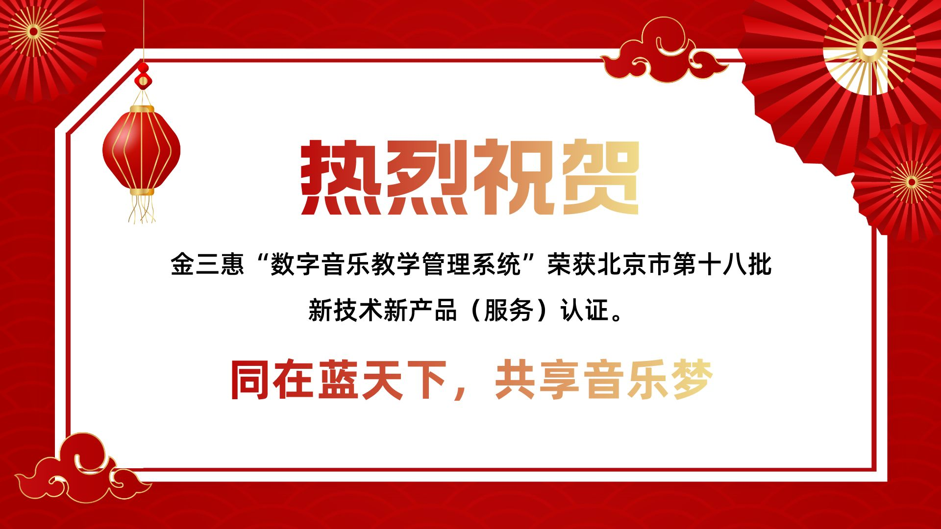 近日,根據《北京市新技術新產品(服務)認定管理辦法》(京科發〔2014〕622號)規定,金三惠“數字音樂教學管理系統”榮獲由北京市科學技術委員會、中關村科技園區管理委員會、北京市科學技術委員會、中關村科技園區管理委員會等5部門聯合頒發的北京市第十八批新技術新產品(服務)認證。