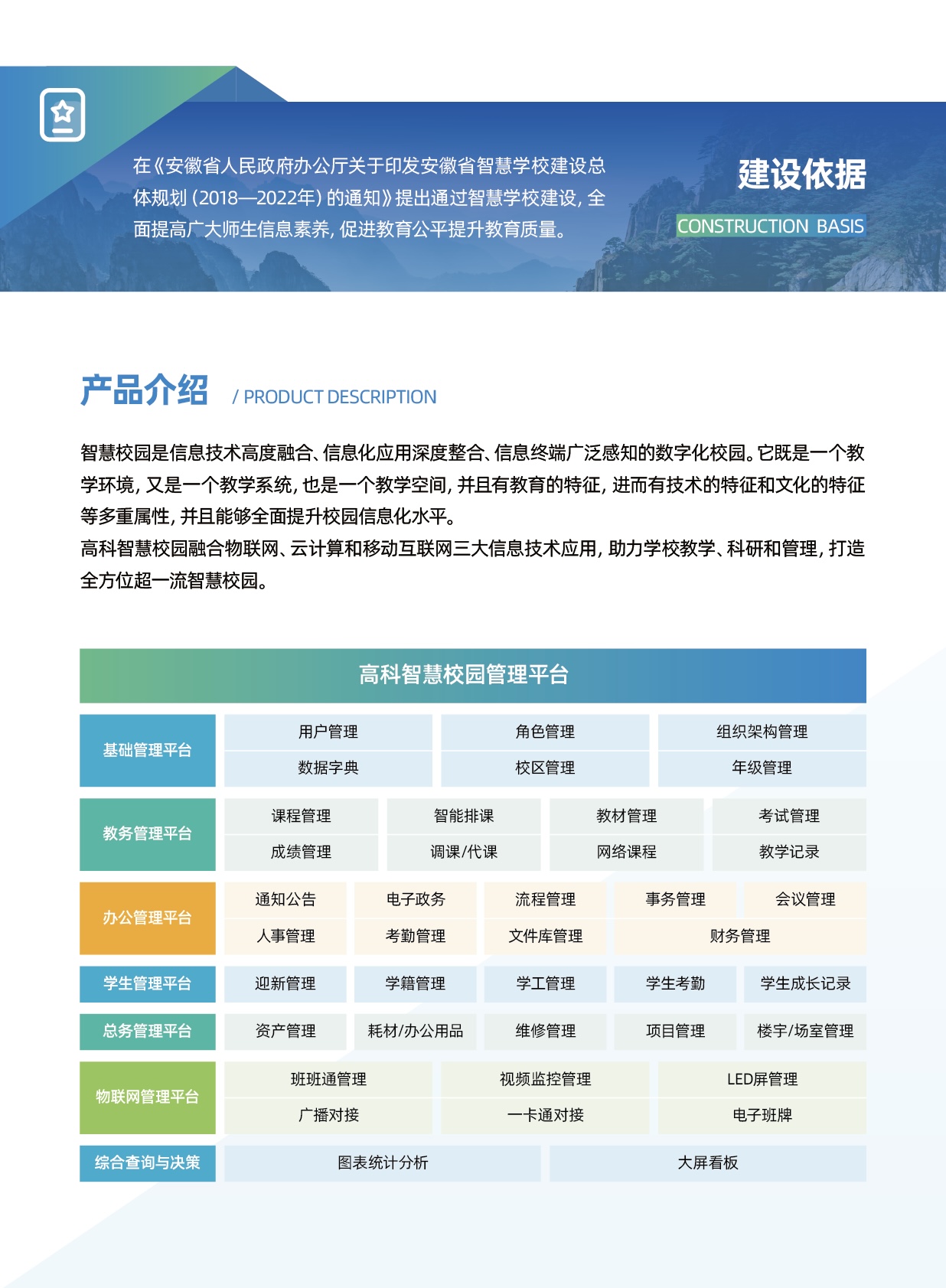 (8)、第三方系統(tǒng)對接:一卡通對接、短信對接、廣播對接、LED屏對接等。 智慧教育管理系統(tǒng)可分為公文管理、流程管理、會議管理、人事管理、資產(chǎn)管理、移動辦公、消息管理六個(gè)模塊。
