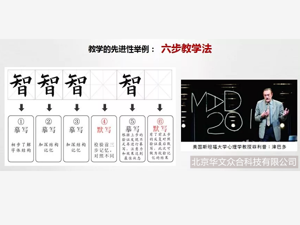 此外,華文眾合數字書法教學系統還采用國際先進的“六步教學法”進行書法學習和練習,教學效果良好,學生進步明顯。有案例表明,某學校的學生在使用“六步教學法”進行一個學期的練習之后,80%能夠脫離臨摹臺進行創作。
