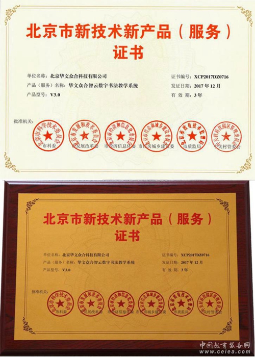 北京華文眾合科技有限公司生產的“智云+數字書法教學系統”,在眾多產品中嶄露頭角,經過認定小組聯合審定,最終獲得“北京市新技術新產品(服務)證書”。