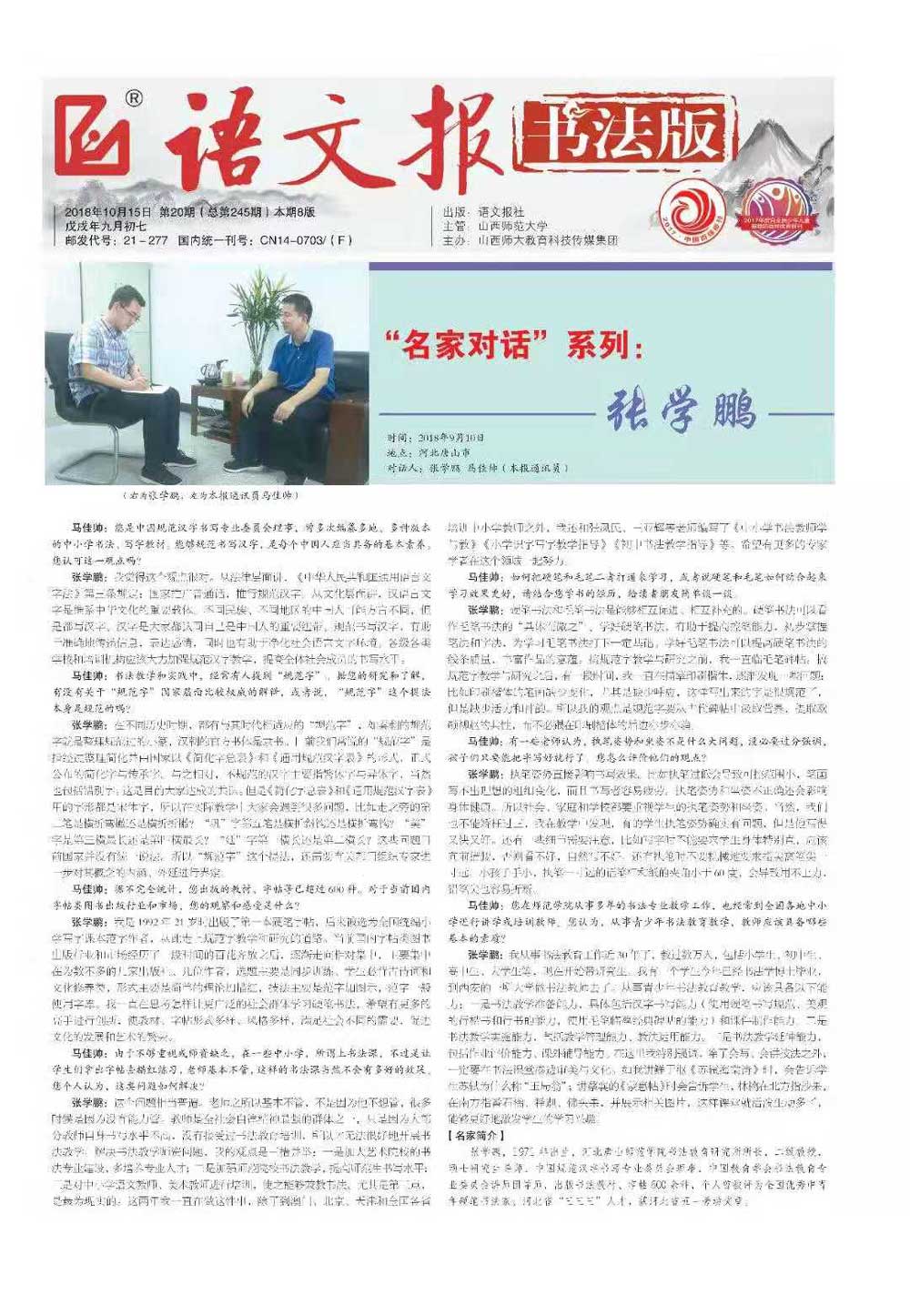 2018年10月15日,《語文報·書法版》(第20期)邀請到了我國著名書法家、教育部、中國文聯(lián)“翰墨薪傳”培訓工程主講專家、唐山師范學院書法教育研究所所長、華文眾合硬筆書法教學首席專家張學鵬,做客“名家對話”接受專訪。