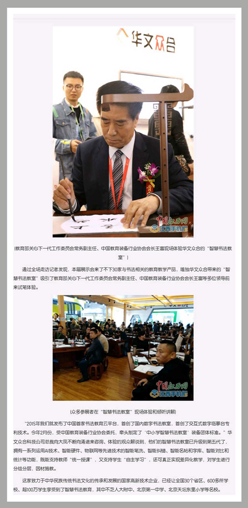 華文眾合歷經五代產品升級所研發的智慧書法教室亮相第75屆全國教育裝備展示會,融合AI技術、智能硬件、物聯網等先進技術的新產品向參展者詮釋了其智慧所在,并吸引中央電視臺、央視書畫頻道、央視網、江西衛視、江西教育電視臺、中國江西網等等多家媒體采訪報道。