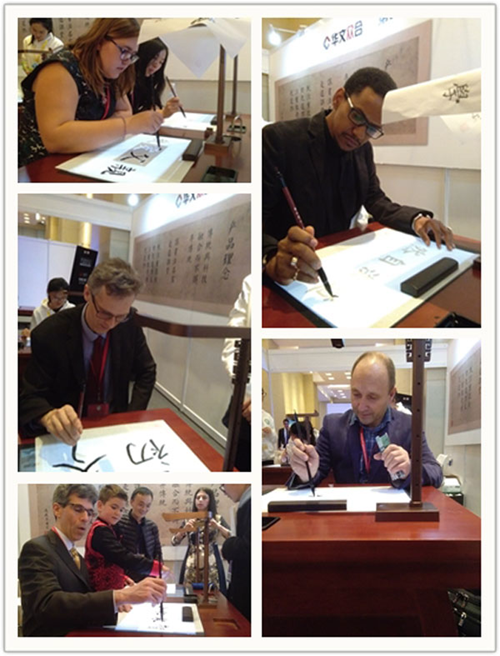 昨天,第十三屆全球孔子學院大會在成都開幕,來自150多個國家和地區的大學校長、孔子學院代表近1500人參加大會。華文眾合攜自主研發的第五代智慧書法教室亮相孔子學院大會,融合AI技術、智能硬件、物聯網等先進技術的新產品吸引眾多參會者體驗、了解,共話漢語海外教學和文化交流。