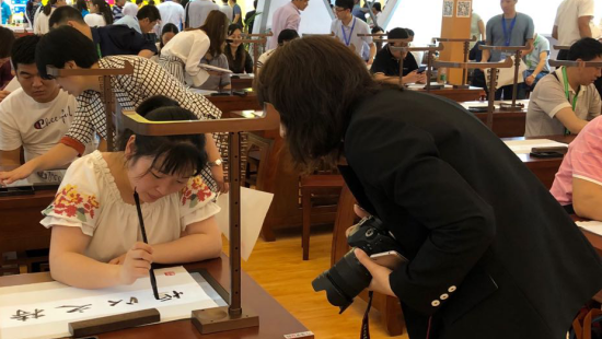 由家長陪同從武漢過來參加展會的兩位小學(xué)生,剛剛上一年級,小小的手生澀地握著毛筆,充滿興趣、認(rèn)認(rèn)真真,整整寫了一個上午,小朋友們說學(xué)校里也開了毛筆課,老師在電腦上講他們在本子上寫,沒有這個好玩沒有這個好寫。