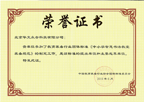繼6月初《中小學智慧書法教室裝備規范》團體標準發布之后,北京華文眾合科技有限公司于日前獲得中國教育裝備行業協會頒發的榮譽證書,華文眾合是《中小學智慧書法教室裝備規范》團體標準的牽頭制定單位,是該標準的提出單位和主要起草單位。