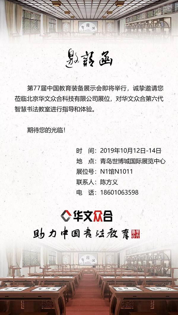 2019年10月12日至14日,以“展示、交流、合作、發展”為主旨的第77屆中國教育裝備展示會將在青島世博城國際展覽中心舉行。華文眾合將攜最新產品——第六代智慧書法教室亮相本次展會,在N1館N1011恭候您的光臨。