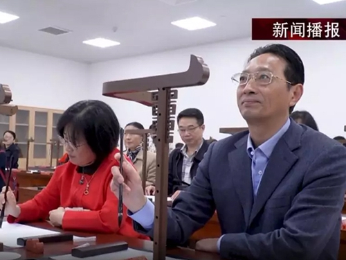 教育部離退休干部局黨委書記、局長(zhǎng)于虹(左)體驗(yàn)華文眾合智慧書法教室