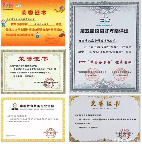 華文眾合是專注于智慧書法教育的國家高新技術企業,是《中小學智慧書法教室裝備規范》的標準提出單位和牽頭制定單位。2015年構建智慧書法教室模型并首次推向市場;2016年發明交互式數字臨摹臺;2017年獲北京市政府創新項目基金支持,并獲得《北京市新技術新產品(服務)證書》;2018年2月在中國教育裝備行業協會的領導下牽頭制定《中小學智慧書法教室裝備規范》團體標準,該標準于2019年6月3日發布,7月1日實施;2019年華文眾合智慧書法教室被評為第76屆中國教育裝備展示會金獎產品,連續入選2018、2020中國教育裝備行業協會年度推薦產品;2019年入選“中關村高新技術企業2019高成長TOP100”;多次獲得央視和中國教育電視臺的報道。